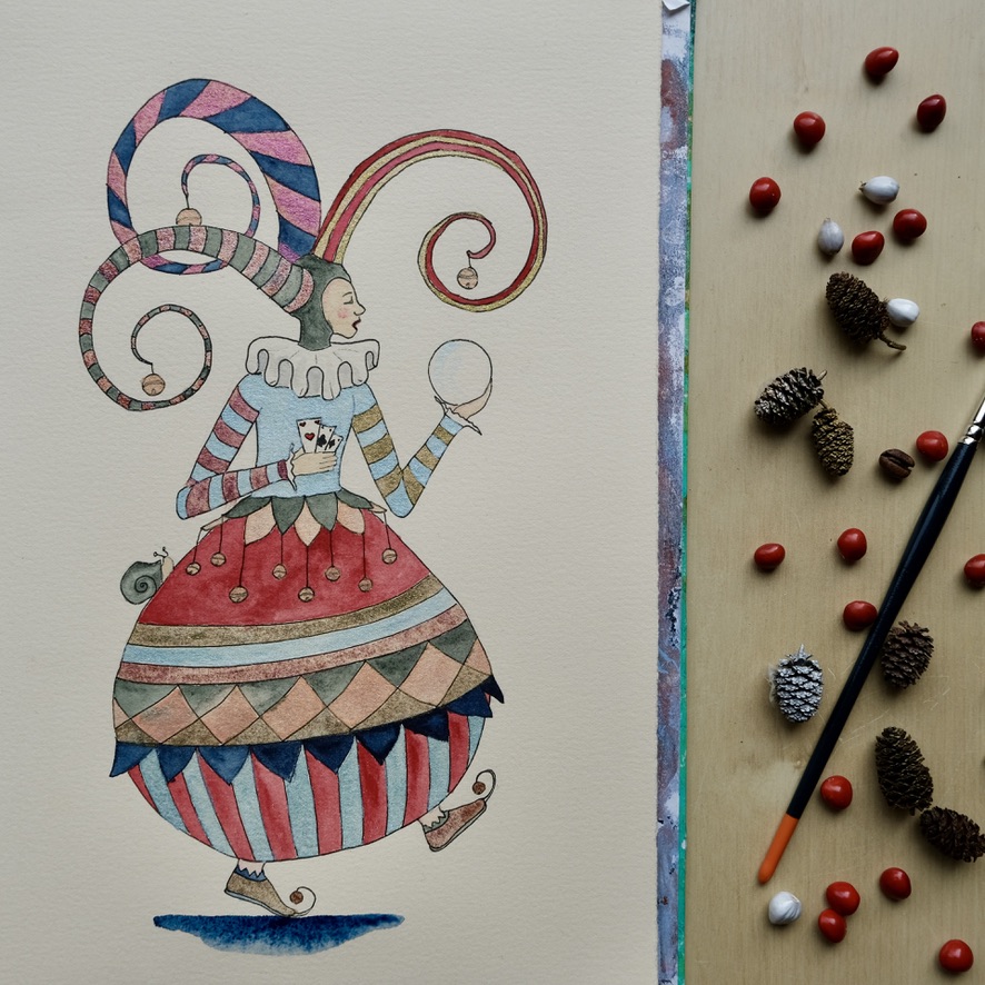 JOUR 1 : "fou" (le fou des cartes à jouer). J'ai mixé des ingrédients trouvés ça et là dans des illustrations anciennes sur le sujet. Avec des aquarelles à paillettes !